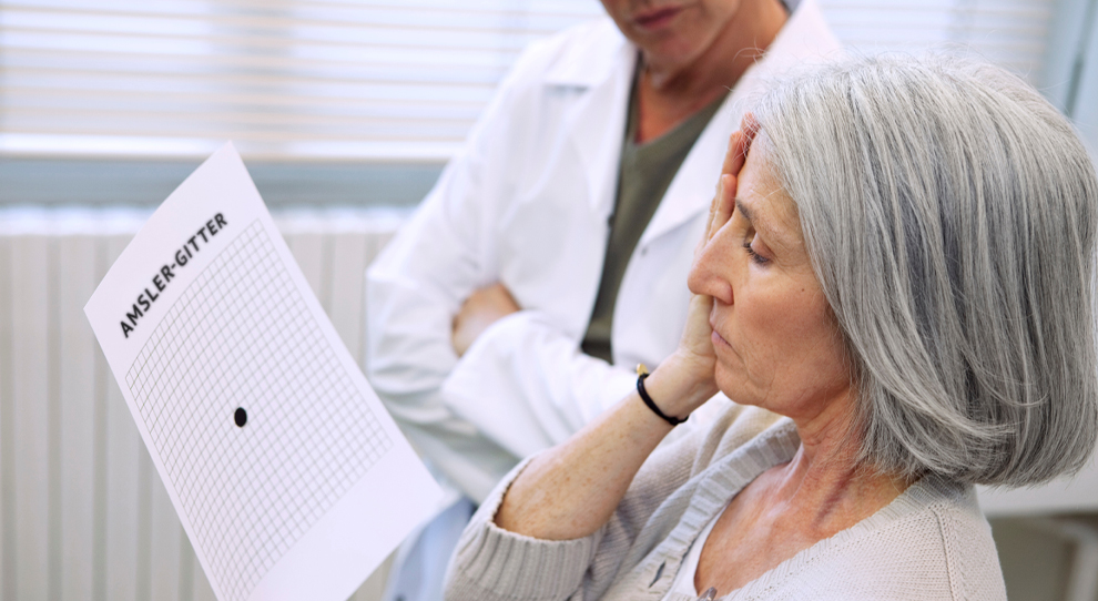 Bei der altersabhängigen Makula-Degeneration (AMD) gehen die Netzhautzellen im Bereich der Makula zugrunde. Dadurch wird das Sehen in der Mitte des Gesichtsfeldes verschlechtert – Lesen und Erkennen von Gesichtern werden stark beeinträchtigt. Die Orientierung im Raum ist dennoch möglich, weil sich die grobe Wahrnehmung außerhalb des Zentrums nicht verschlechtert.